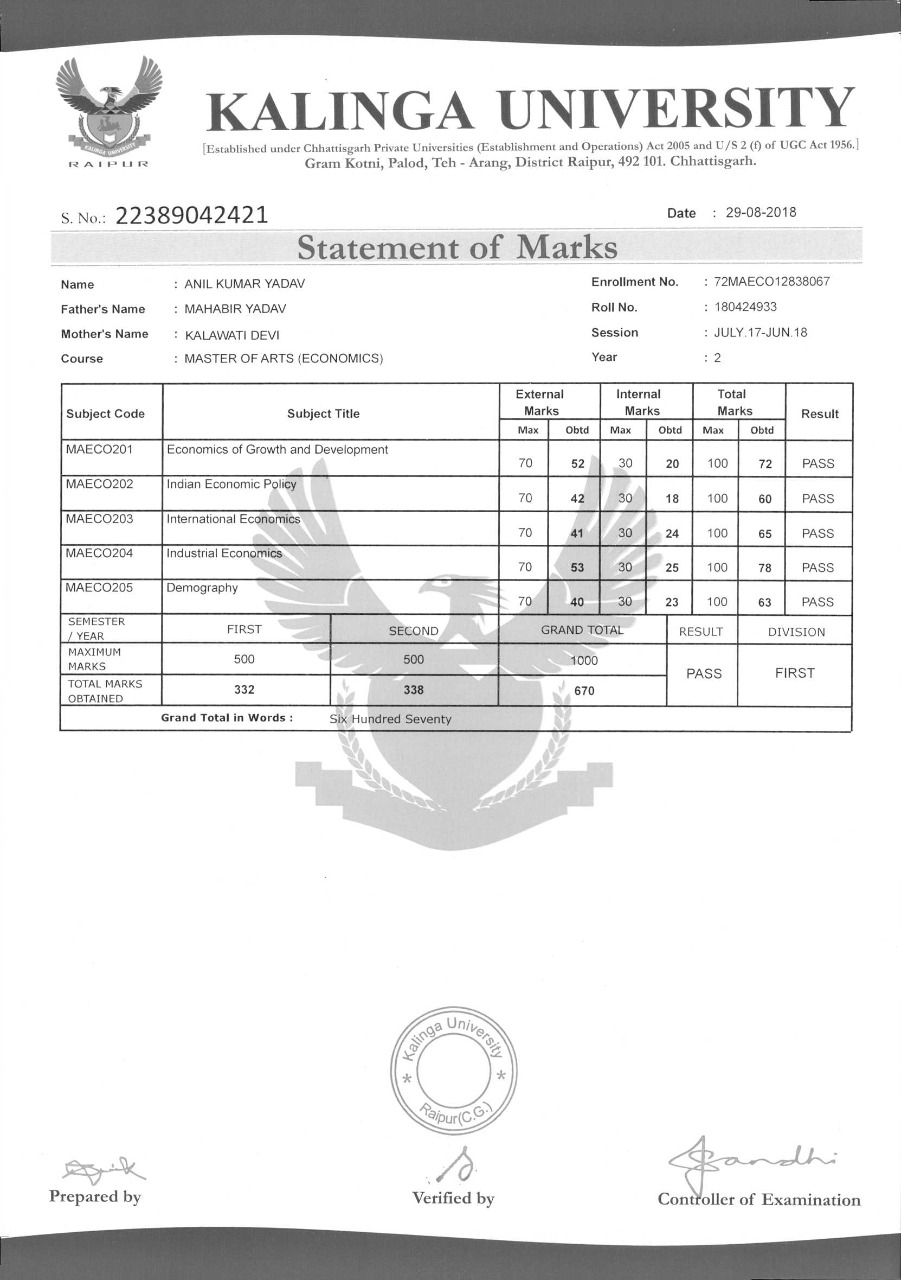 | | Certificate | : KU | | Course | : MA ECO | | Duration | : 2 Year | | Admission Date | : 06-07-2019 | | Total Fees | : Rs. 15400 |