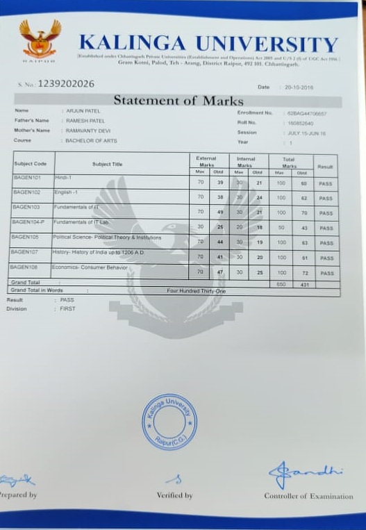 | | Certificate | : KU | | Course | : BAGEN | | Duration | : 3 Year | | Admission Date | : 06-07-2019 | | Total Fees | : Rs. 23350 |