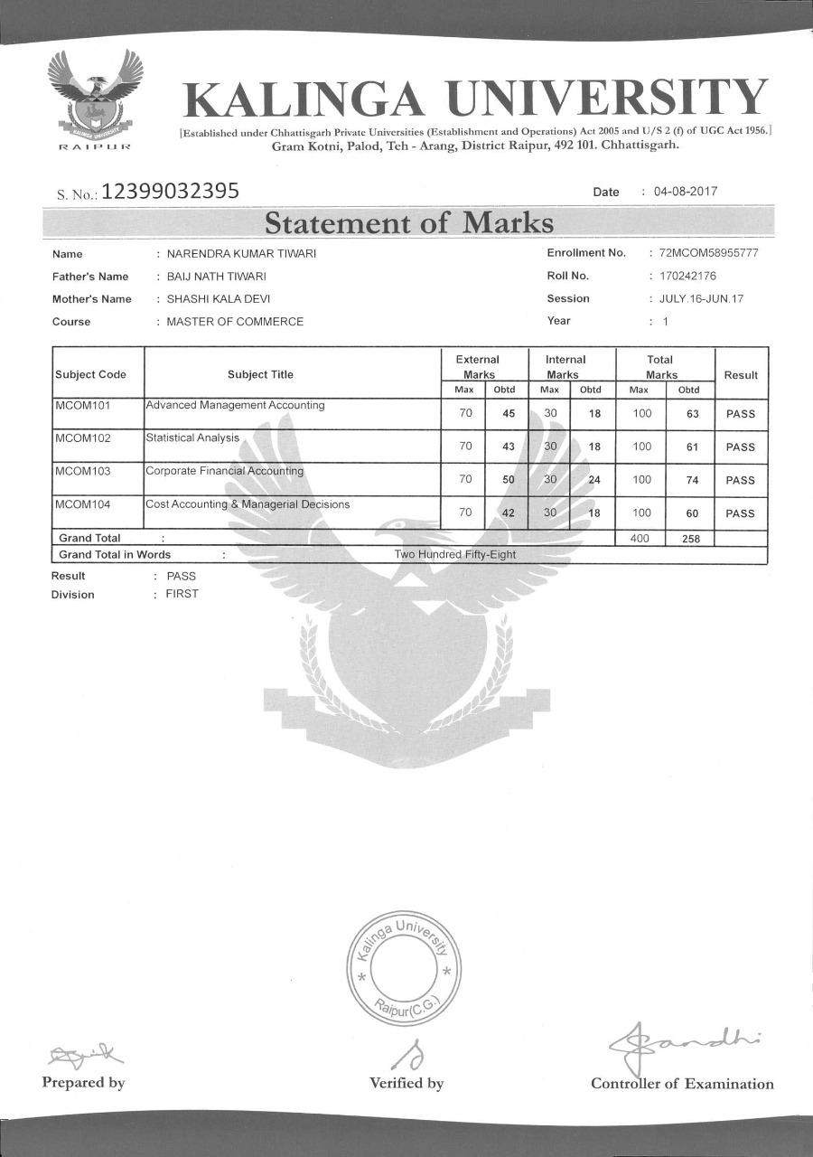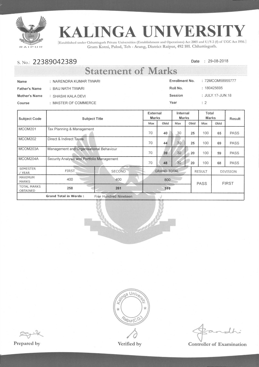 | | Certificate | : KU | | Course | : MCOM | | Duration | : 2 Year | | Admission Date | : 17-07-2019 | | Total Fees | : Rs. 23400 |