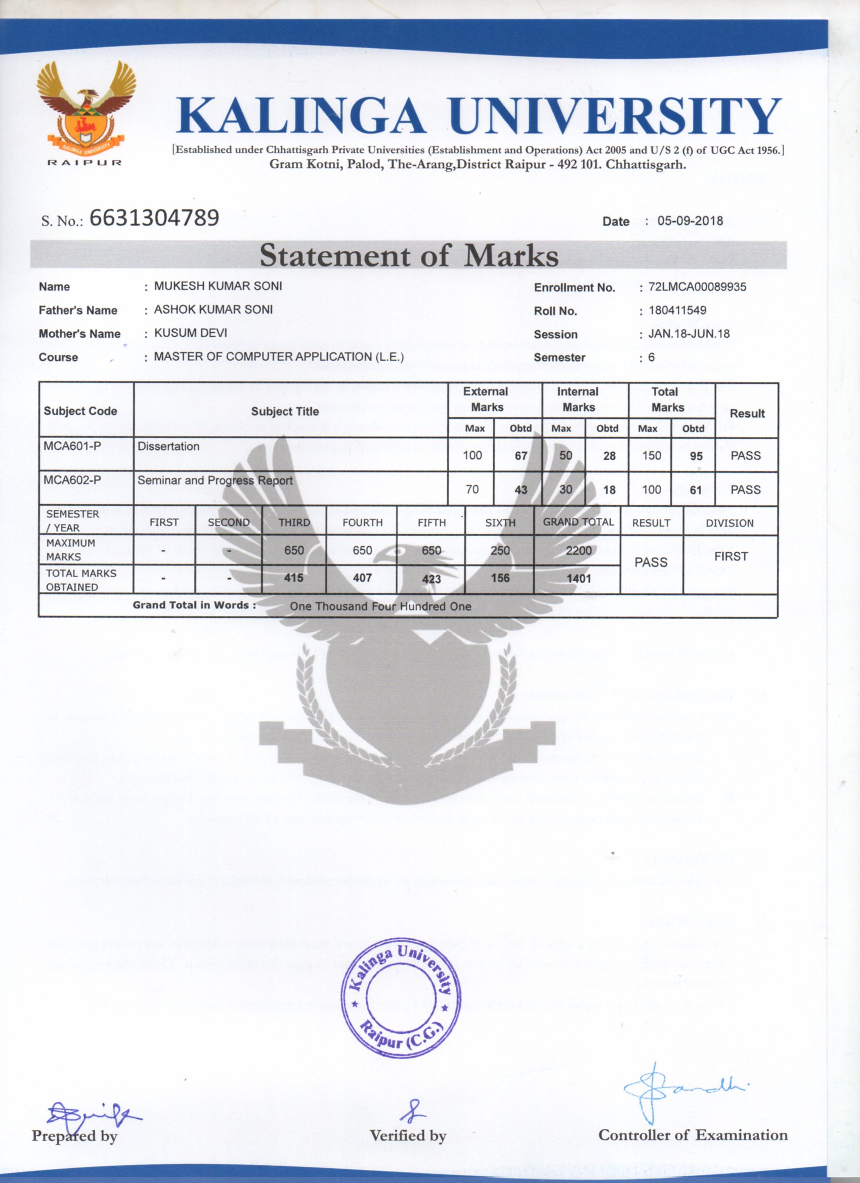 | | Certificate | : KU | | Course | : MCA(L) | | Duration | : 2 Year | | Admission Date | : 22-06-2018 | | Total Fees | : Rs. 49000 |