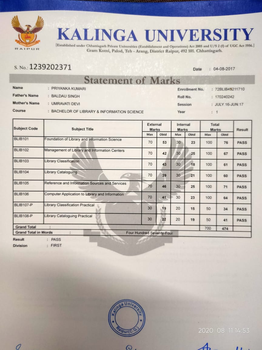 | | Certificate | : KU | | Course | : BLIB | | Duration | : 1 Year | | Admission Date | : 12-01-2019 | | Total Fees | : Rs. 9375 |