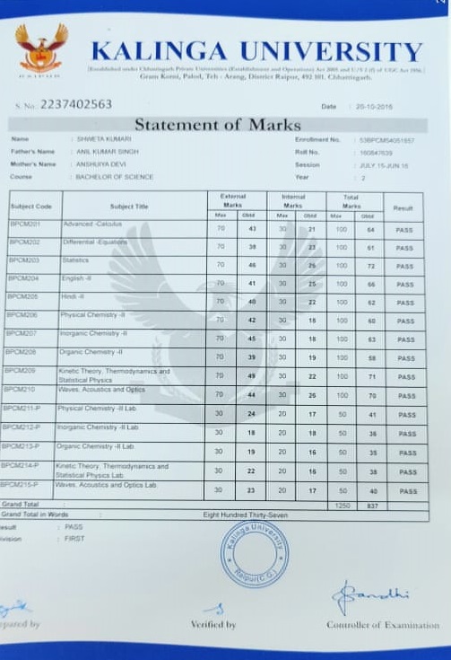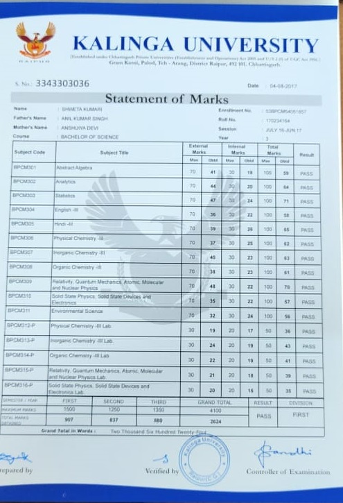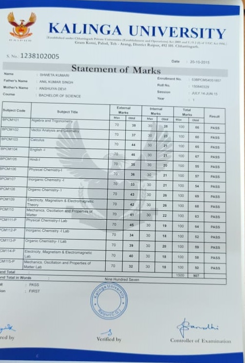| | Certificate | : KU | | Course | : BSC (PCM) | | Duration | : 3 Year | | Admission Date | : 28-05-2019 | | Total Fees | : Rs. 43600 |
