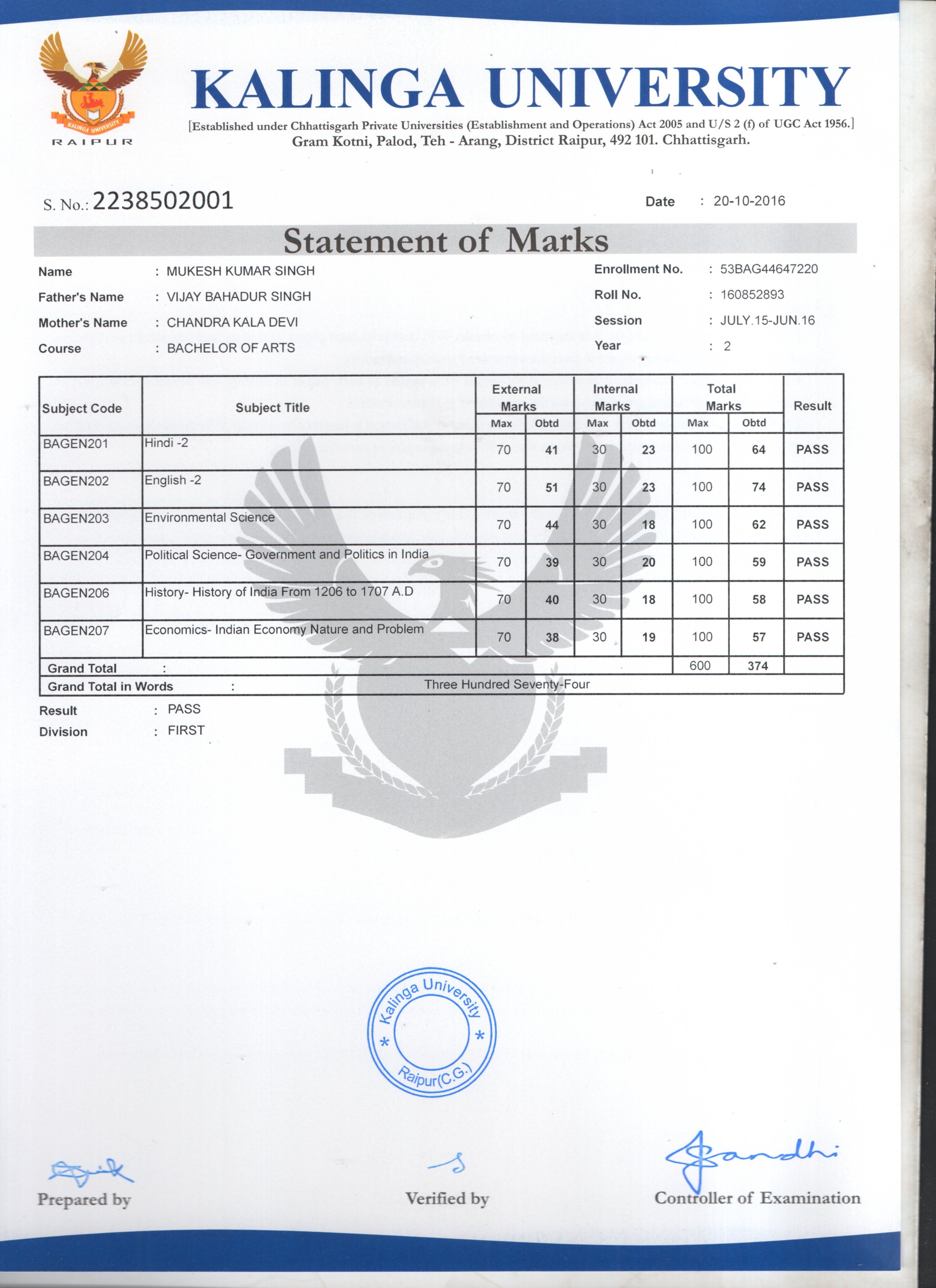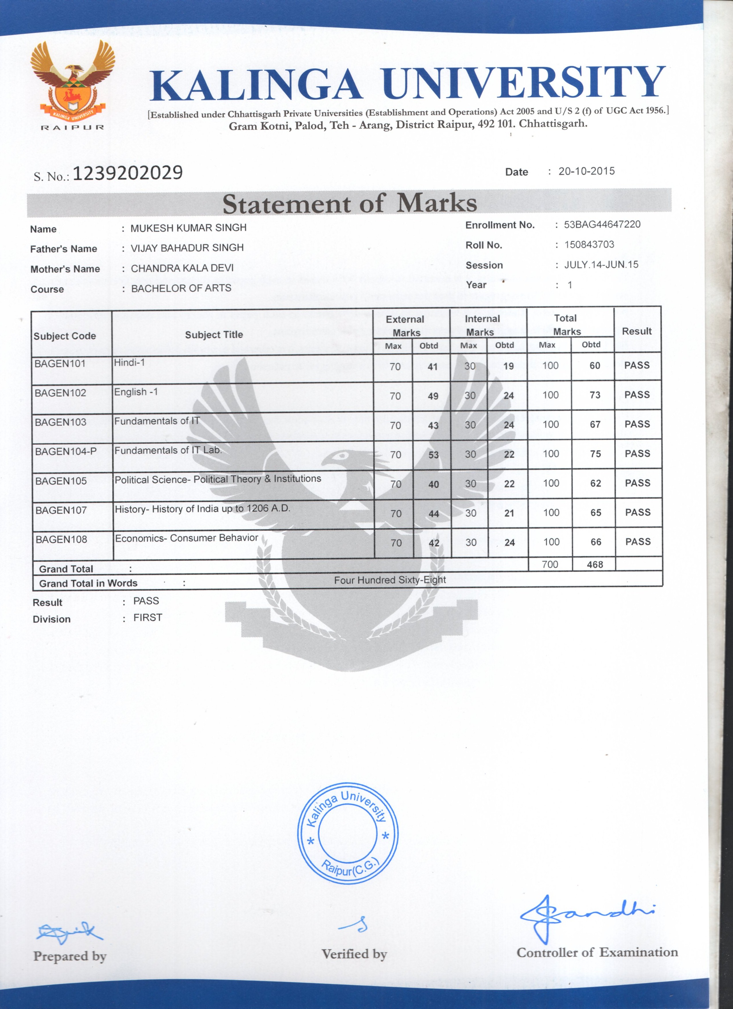 | Enrollment No | : 53BAG44647220